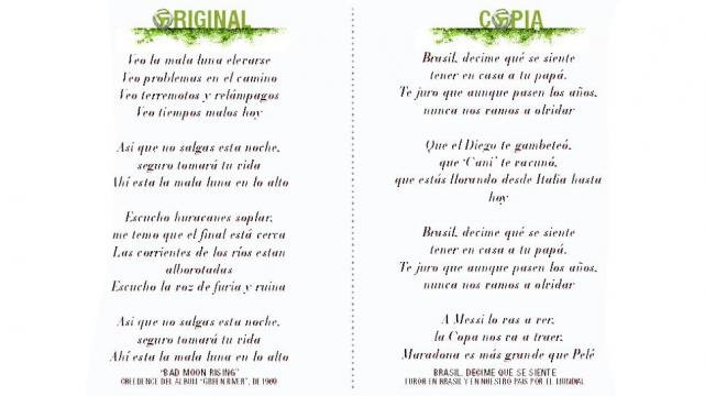 “Brasil, decime qué se siente, tener en tu casa a tu papá”, se animan a cantar los argentinos ante el pentacampeón mundial. Para colmo, el historial general entre ambos equipos favorece al “scracth” por dos partidos: 38 victorias contra 36. Pero lo osado del cántico no es lo más sorprendente, sino, como el de la “lepra”, su origen. La melodía fue extraída de “Bad moon rising” (“Al salir la luna”) de la histórica banda norteamericana Creedence.