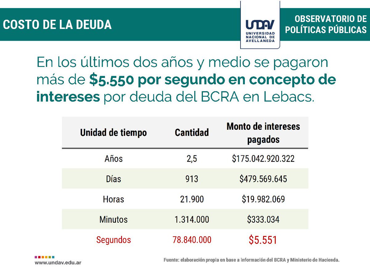 - Infografia @EconomiaenUNDAV Lebacs Durante el macrismo se pagaron 5.551 pesos por segundos de intereses de las Lebacs Por Hora casi 20 millones de pesos Por minuto 333.034 pesos