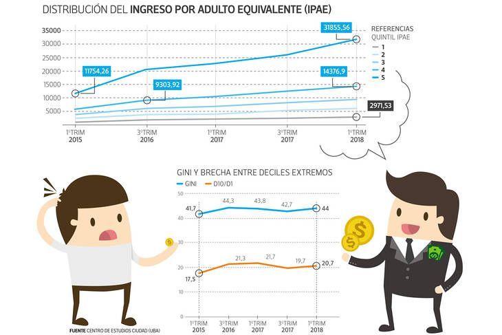 Entre 2015 y 2018, el coeficiente de Gini del IPAE se incrementó en un 5, 5% –pasó de 41,7 puntos porcentuales a 44 en el período analizado–, en tanto que la distancia que separa a los deciles extremos en la distribución del ingreso aumentó un 18,3%, con un crecimiento de 17,5 a 20,7. En ambos casos, señala el trabajo, "se advierten incrementos significativos de la desigualdad".