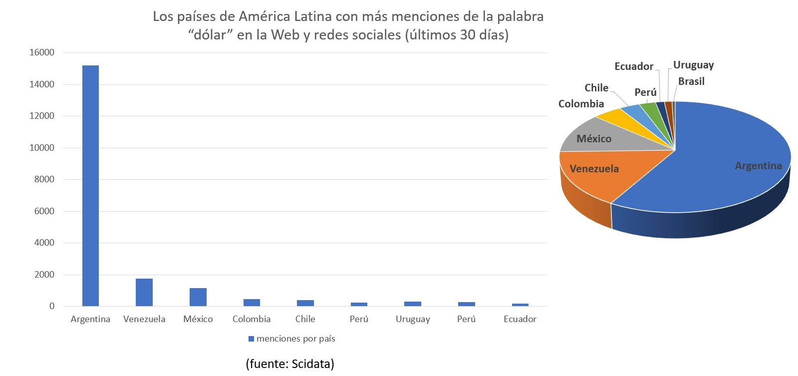 Si tomamos para el análisis los últimos 30 días, el uso del término "dólar" en todas las plataformas digitales sumó más de 15.000 menciones en nuestro país contra 1.753 de Venezuela, 1.166 de México, 408 de Chile y apenas 176 en el dolarizado Ecuador.