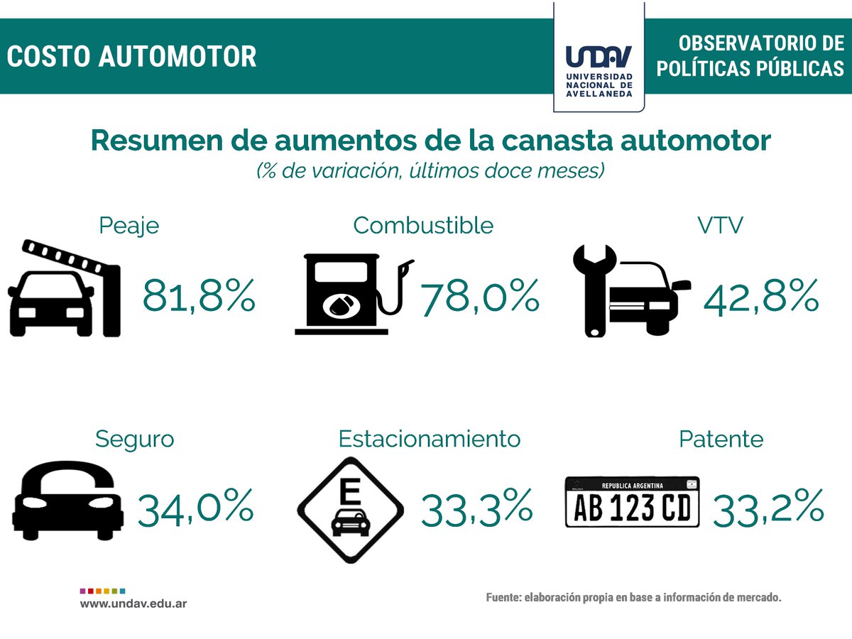 • En el detalle, se tienen algunos aumentos muy considerables. Por caso, el peaje en zonas urbanas llegó a aumentar hasta un 81,8%, mientras que el alza en el combustible fue del 78% acumulado anual. Más en línea con la inflación, se tienen aumentos en la VTV del 42,8% y en el estacionamiento del 33,3%.