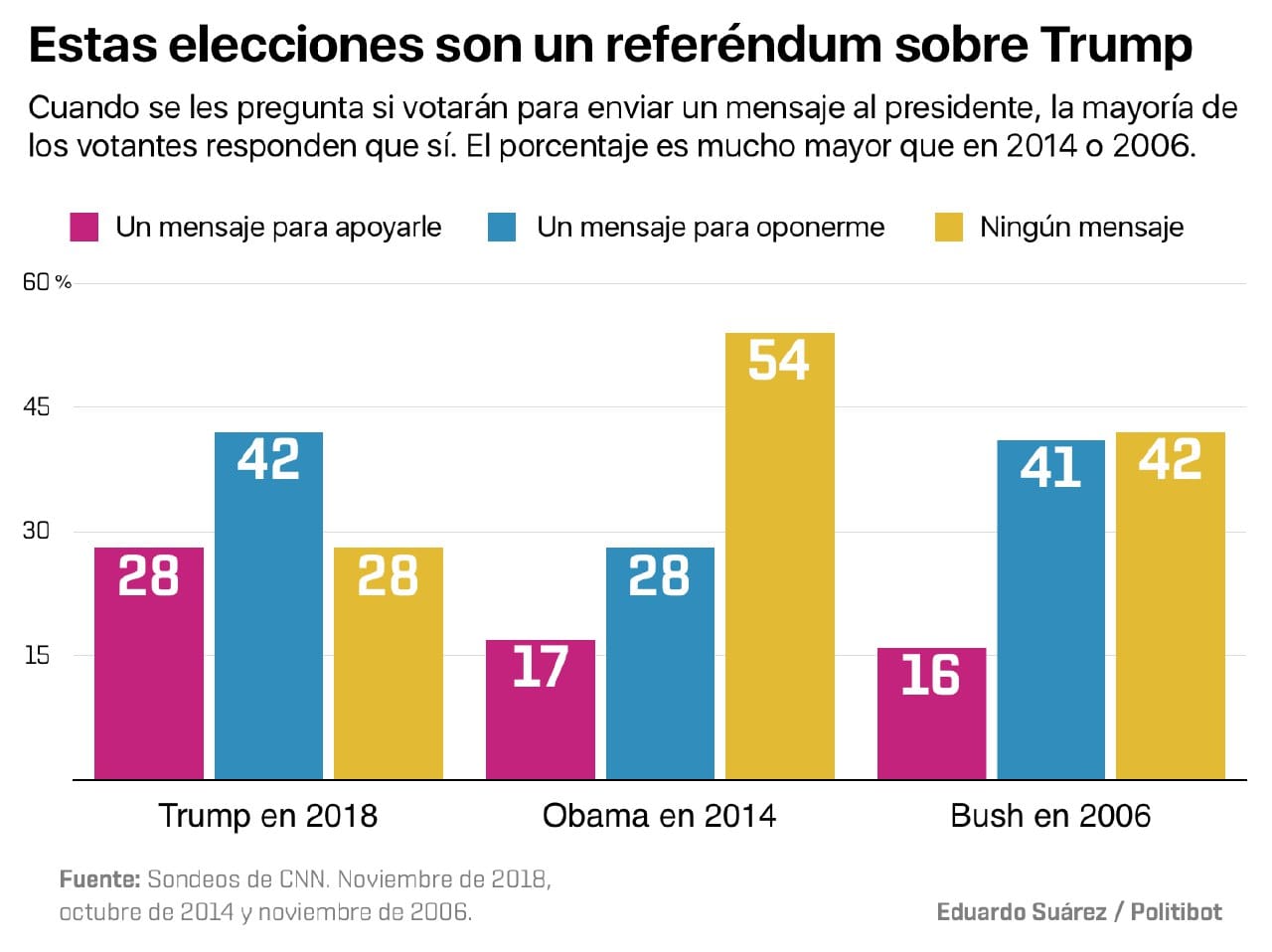 Para ponerlo en contexto, si en las elecciones del 2014 casi el 60 por ciento de los blancos con educación superior votaron por candidatos republicanos, en el 2018 esa cifra es para los demócratas. La mayoría de las encuestas de boca de urna sugieren que el giro fue provocado por el rechazo de este grupo al presidente Trump.