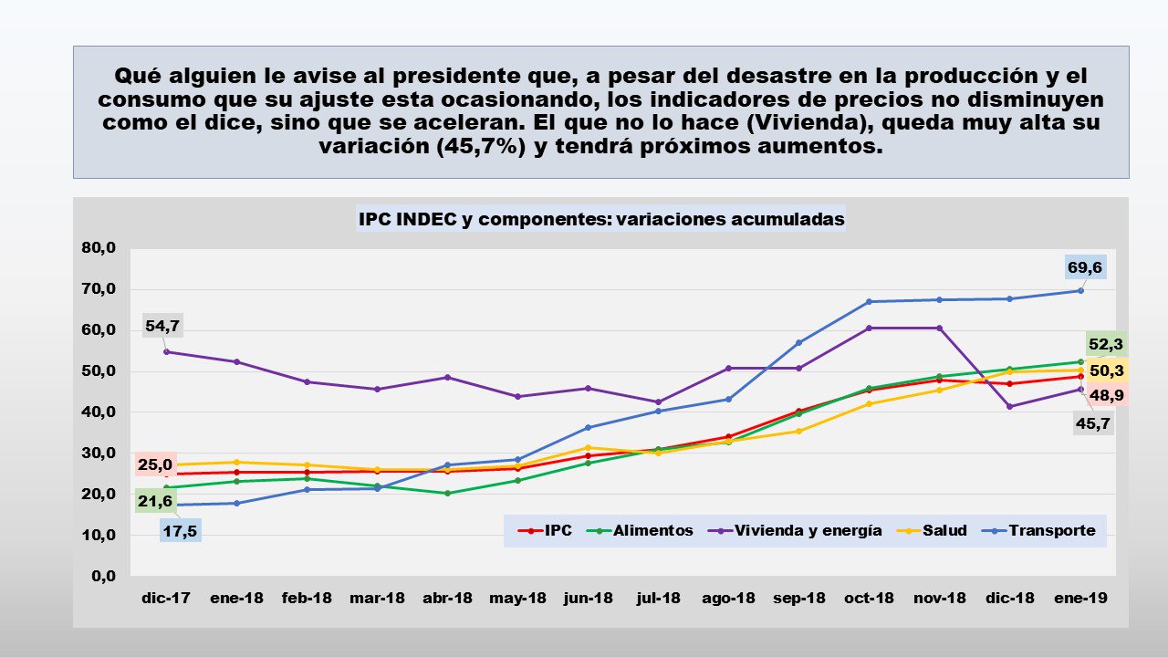 El jueves pasado se conoció la loca inflación de enero de 2019.Los precios al consumidor subieron 2,9% respecto de diciembre y 49,3% interanual, con paritarias promedio que, en ese mismo lapso, crecieron 35%.