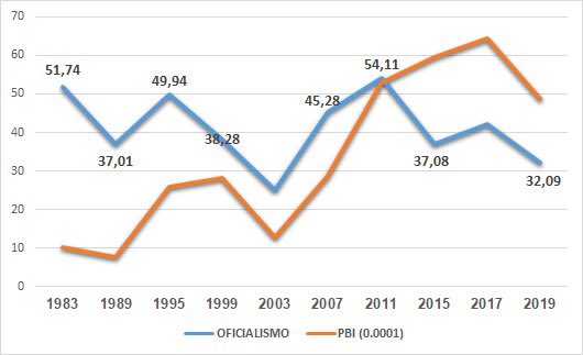 Observen la relación existente entre evolución del PBI y la performance electoral de los Oficialismos. La serie es la comprendida entre los años 1983 y 2019.