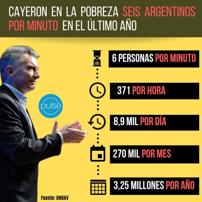 La fábrica de pobres funciona a destajo. Según el Observatorio de Políticas Públicas de la Universidad Nacional de Avellaneda (UNDAV), entre el primer semestre de 2018 y el primer semestre de 2019, se generaron 6 nuevos pobres por minuto.