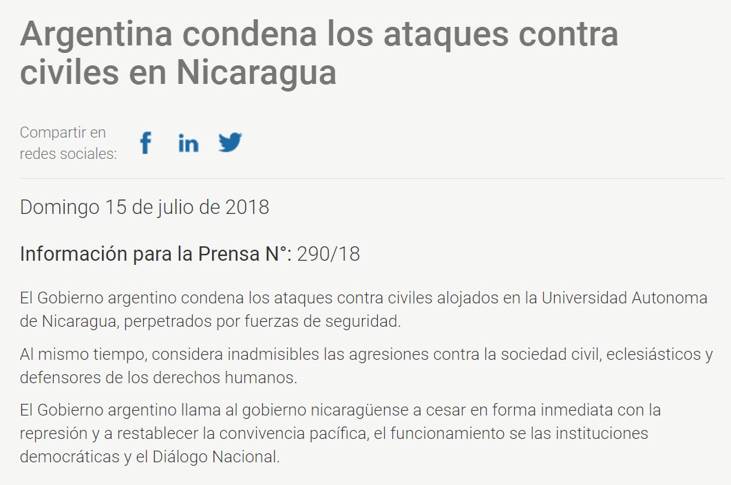 Estos son los comunicados emitidos por @CancilleriaARG condenando los hechos de violencia y ataques sobre la sociedad civil en Nicaragua en junio-julio de 2018. ¿Por qué el gobierno argentino ahora decide permanecer en silenció frente a la brutal represión desatada en Bolivia? La pregunta de OCIPEx @OCIPEx_arg es pertinente.