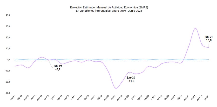 Aunque algunos lo nieguen, la recuperación de la actividad es evidente: en junio de 2021, el EMAE registró variación de 10,8% respecto al mismo mes 2020 y un alza de 2,5% respecto a mayo en medición desestacionalizada (s.e.). Acumula en el primer semestre un aumento de 9,7% i.a.