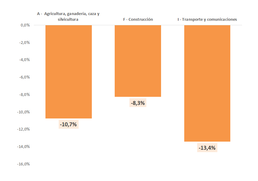 b. Los sectores que no lograron recuperarse con la misma celeridad que las previamente mencionadas y se encuentran 10% en promedio por debajo del 2019: Agricultura, Construcción y Transporte