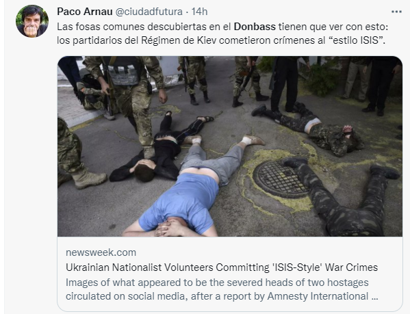 Pero quiero centrarme en la guerra q estalló en Ucrania en el año 2014, a la cual, vuestros insulsos carteles están llegando 8 años tarde. Todo el mundo puede despistarse, todos podemos cometer errores, pero también es posible que haya algo más perverso en según qué “descuidos”.