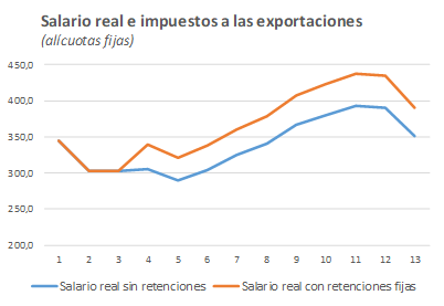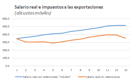¿M谩s retenciones? Mis colegas me dicen que NO es pol铆ticamente viable (quiz谩s tengan raz贸n). Pero… Hagamos un ejercicio puramente intelectual. Supongamos un aumento de retenciones (DEX) ya sean fijas o m贸viles. ¿C贸mo funciona?