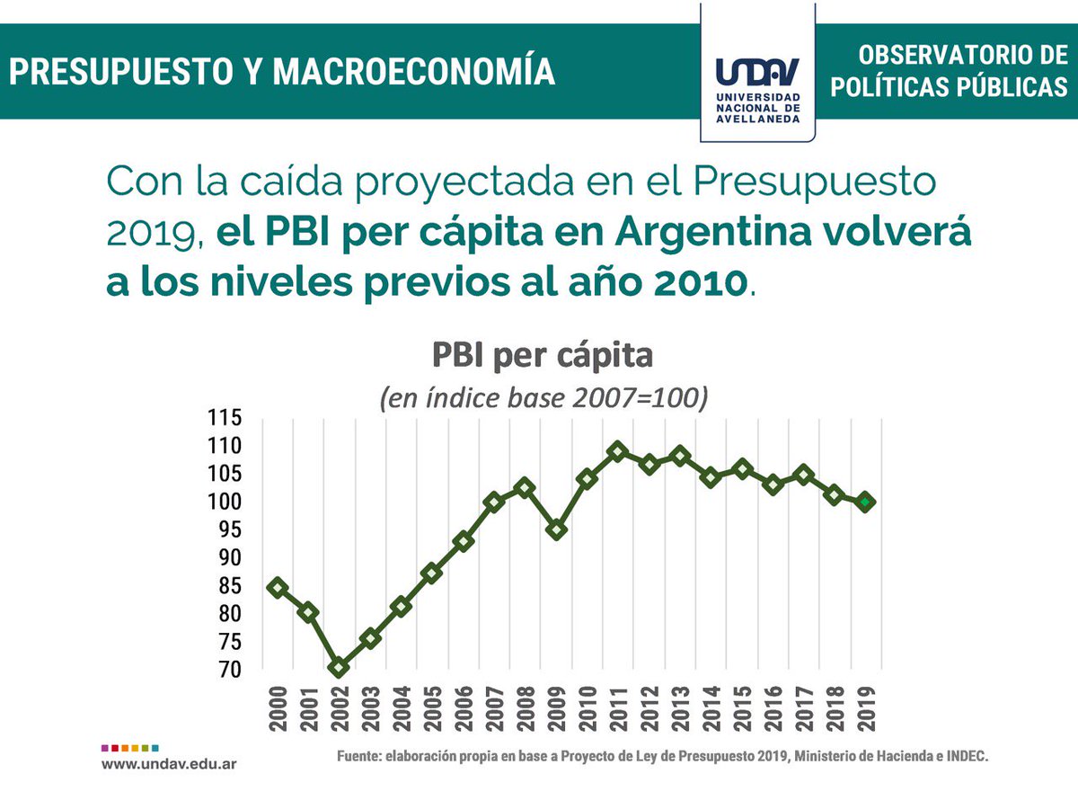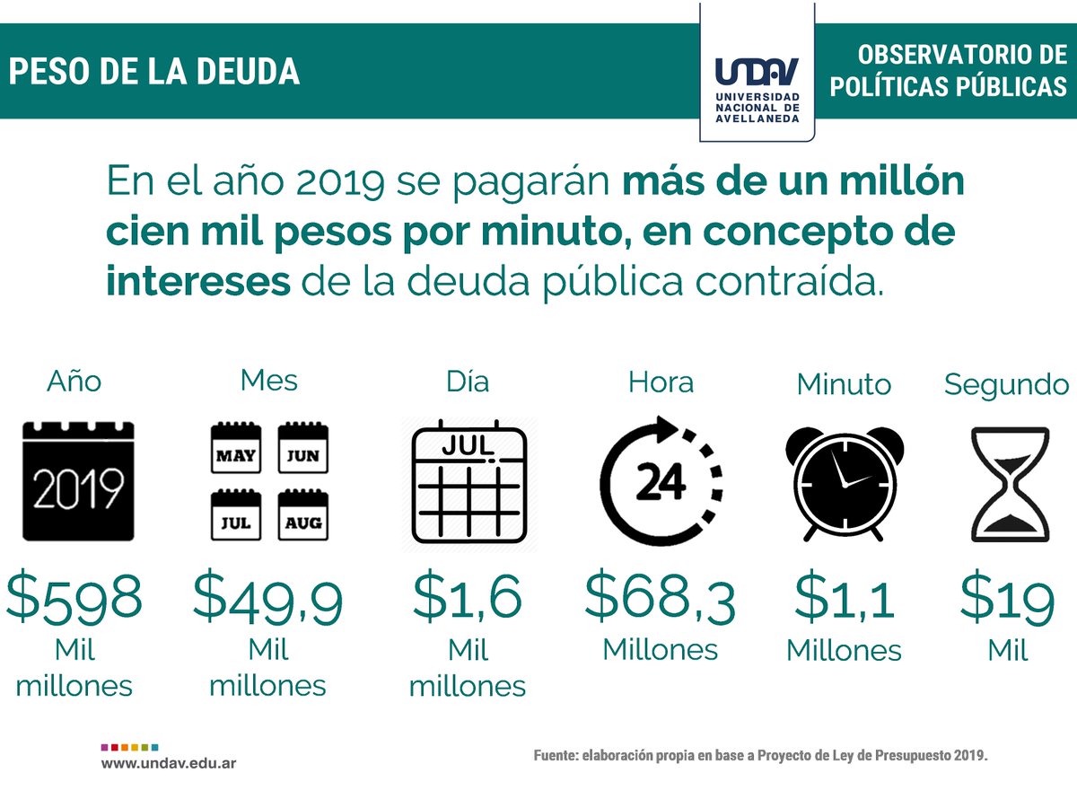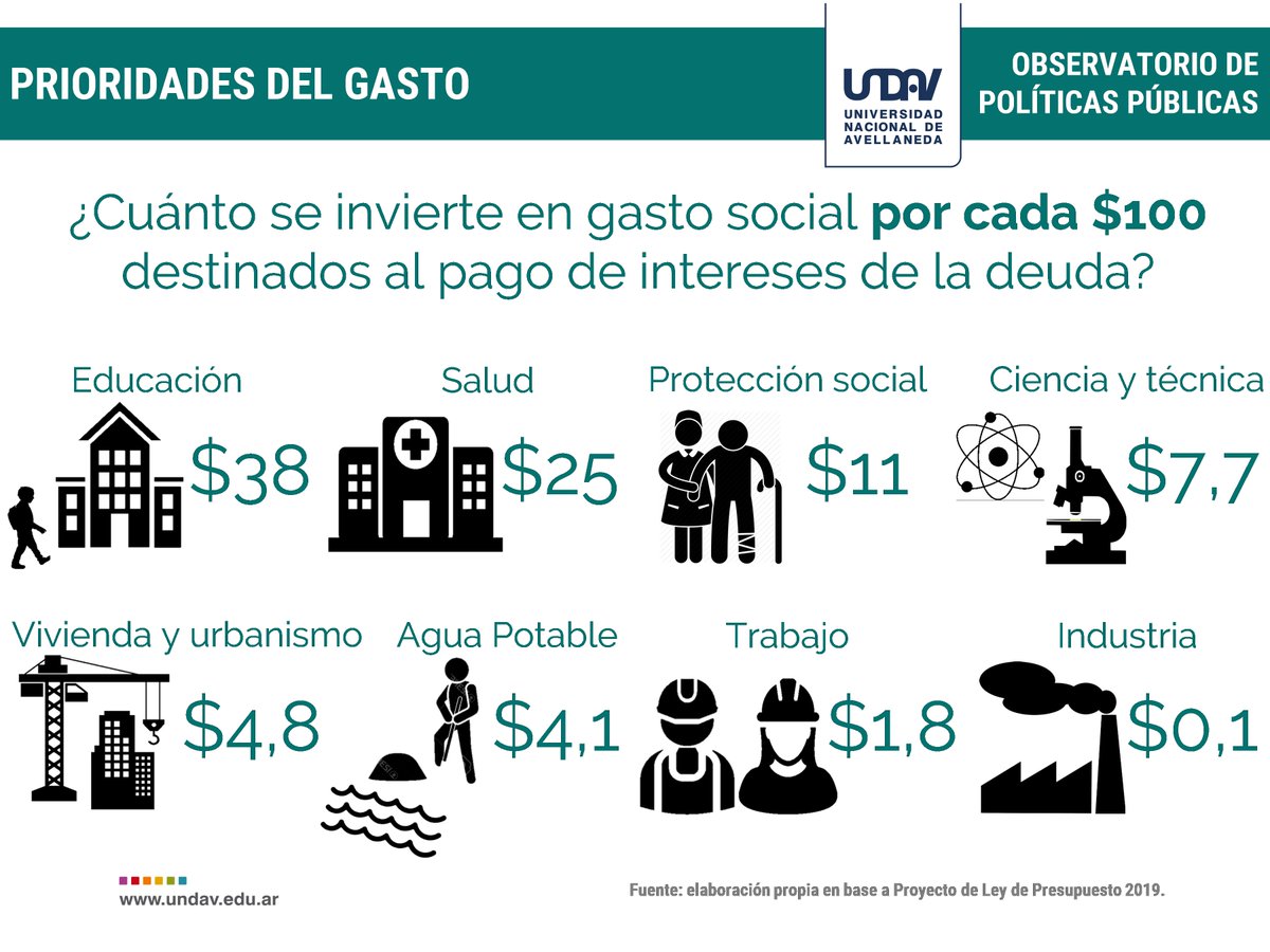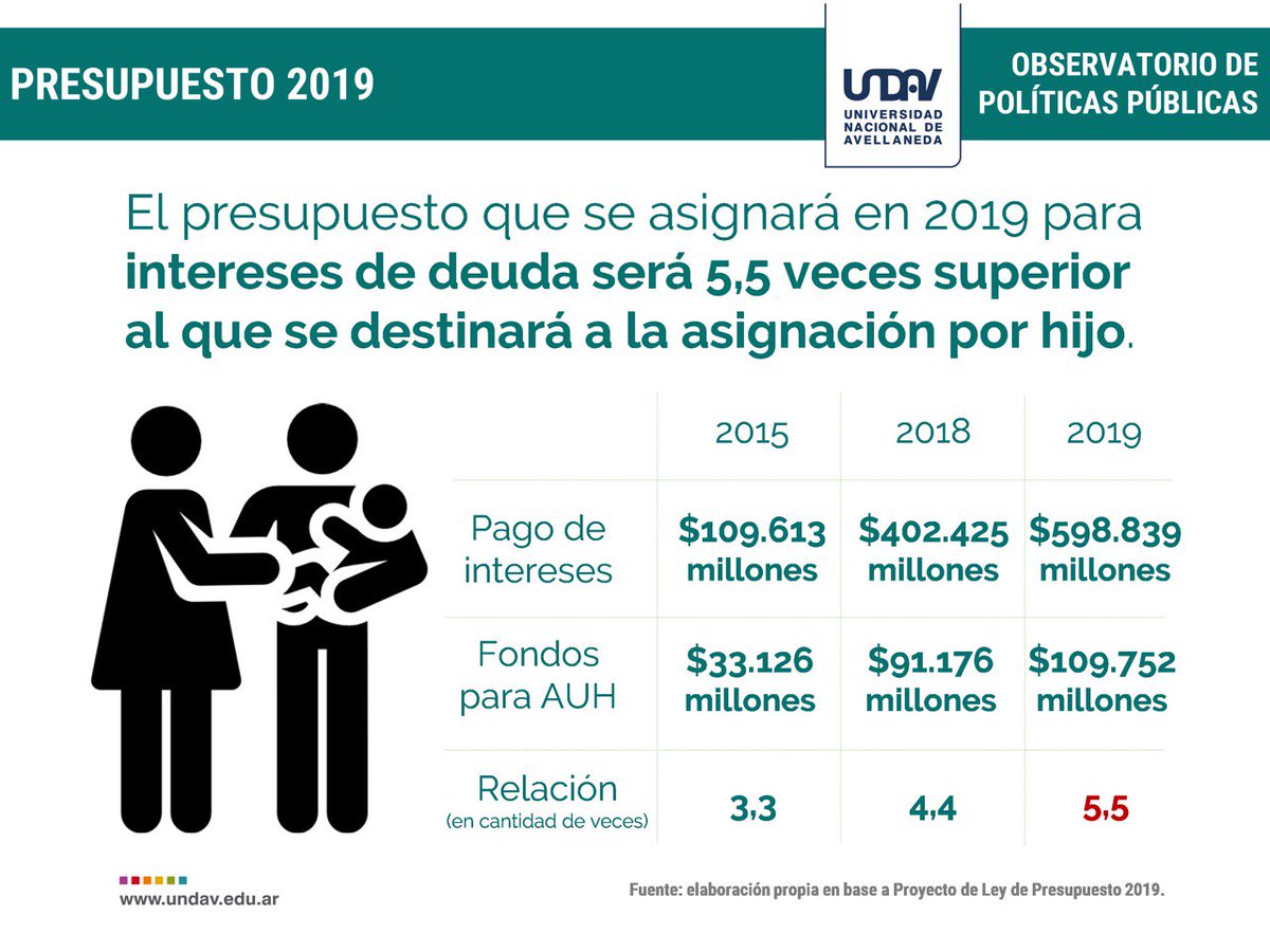 En contraposición a la relevancia prioritaria que se establece para los intereses de la deuda, los programas sociales han perdido peso relativo en contraste con la incidencia que tenían en 2015. Por caso, los servicios de deuda pasarán de representar 3,5 veces el monto destinado a la Asignación Universal por Hijo (AUH) en 2015, a 5,5 veces en 2019, lo que equivale a un monto de 353 millones de AUH o 69 millones de jubilaciones mínimas, casi 56 millones de salarios mínimos y la construcción de casi 20 mil jardines de infantes. En 2019 se pagarán por intereses un monto equivalente a 1.100.000 pesos por minuto, o 1600 millones de pesos por día.