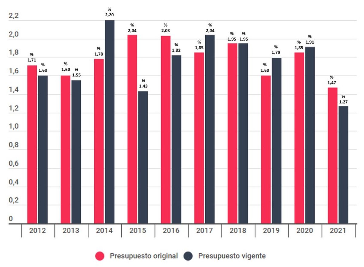 Si nos concentramos en las cifras del último año, no en la ejecución sino en el presupuesto original, tendríamos que para cumplir con lo dispuesto por el artículo 32 de la ley deberíamos más que duplicar el 1,47% sino triplicarlo, para no repetir la experiencia histórica 2013/2015 y considerando que hay chances concretas de que una gestión enemiga de la LNSM retorne al gobierno en 2023.